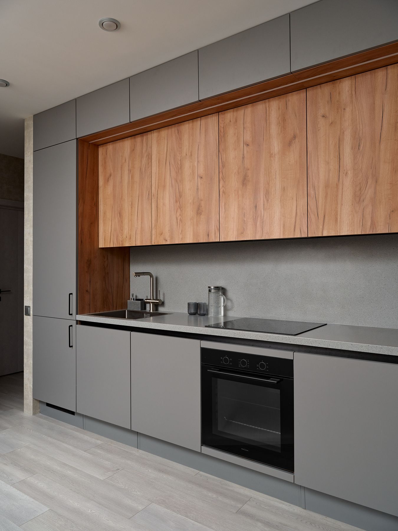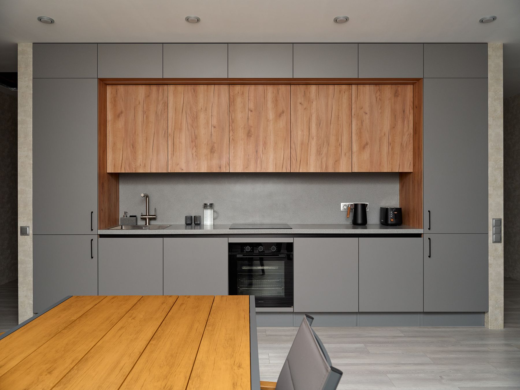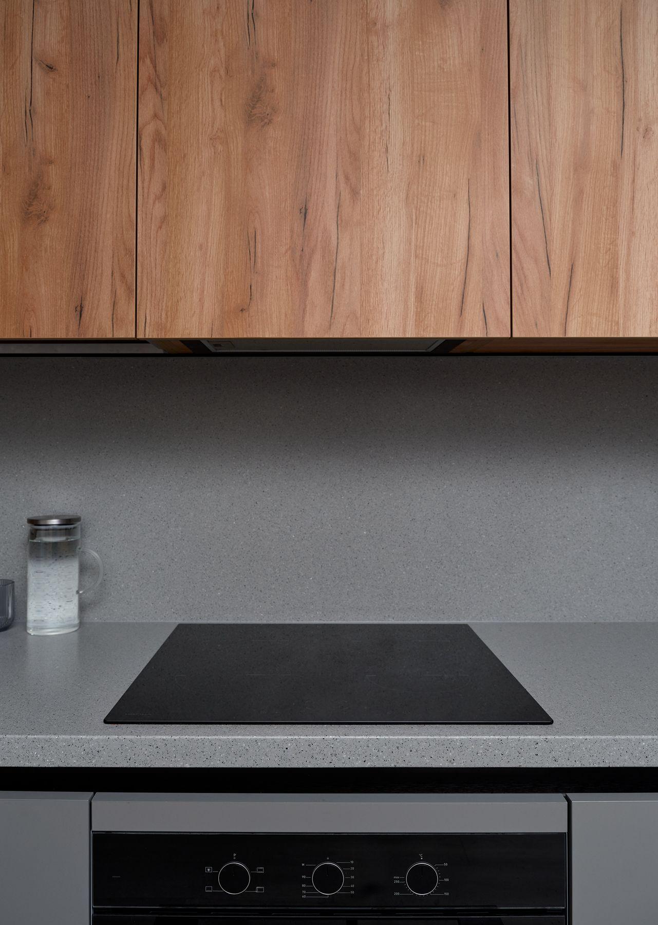 Планировка кухни – прямая, с симметричной геометрией. В центре – удобная рабочая зона, по бокам – высокие секции-колонны, а сверху – антресоли под самый потолок. Это решение дает максимум мест для хранения без визуального перегруза. Фасады выполнены в декорах «Дуб Крафт золотой» и «Пыльный серый». Столешница и фартук из искусственного камня с гранитным рисунком выглядят монолитно, без видимых стыков – семья уже оценила преимущества этого материала на предыдущей кухне.