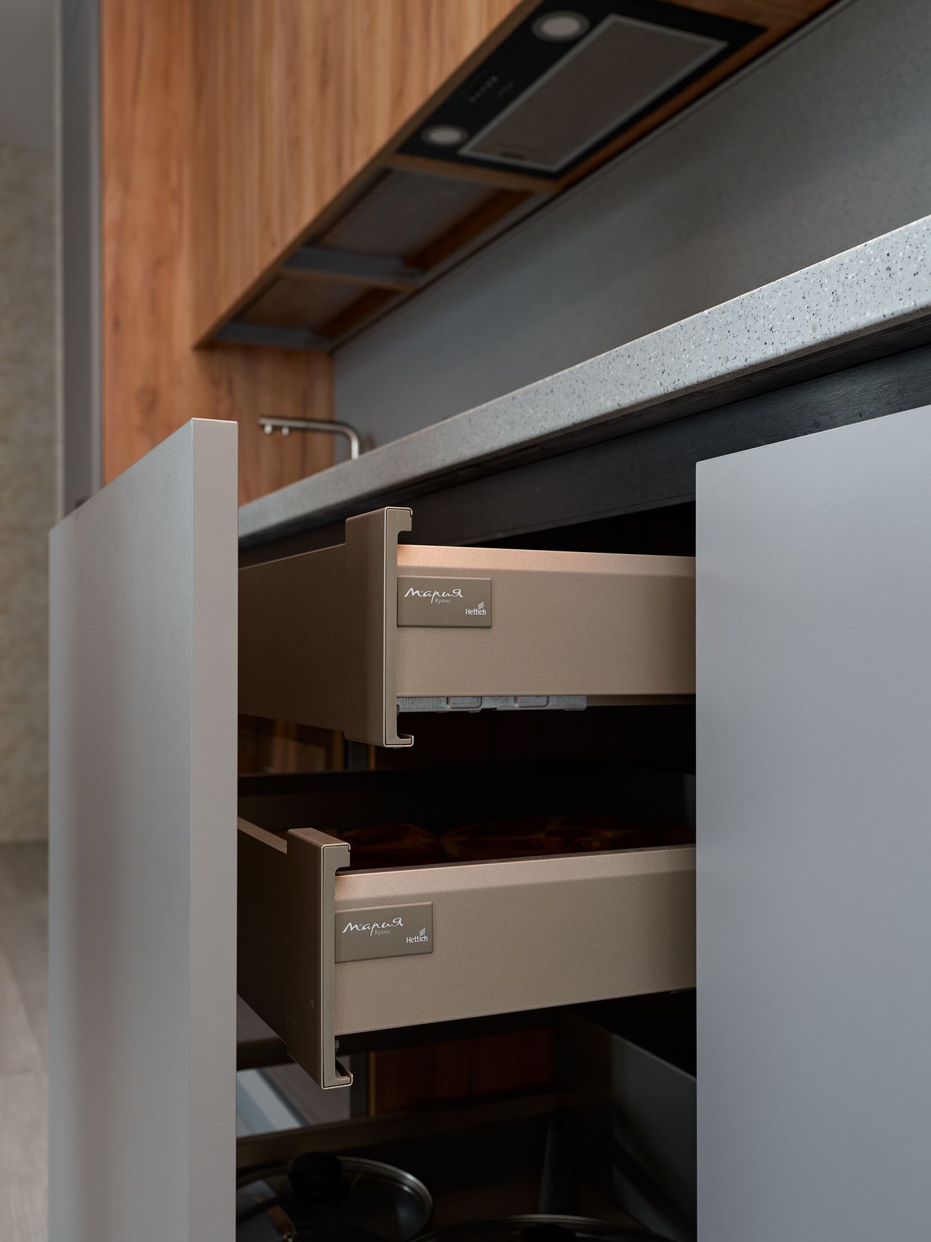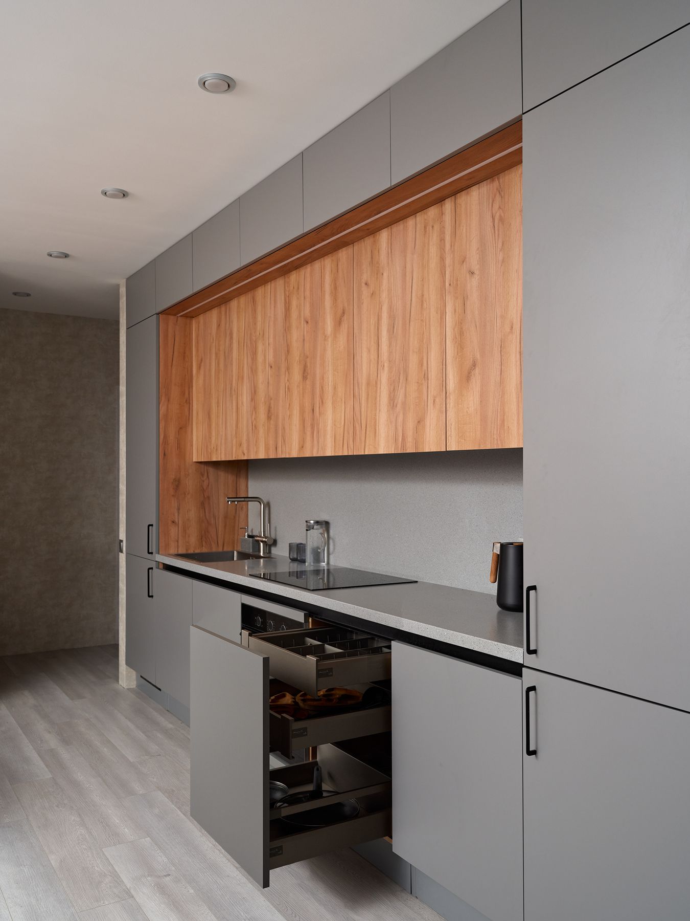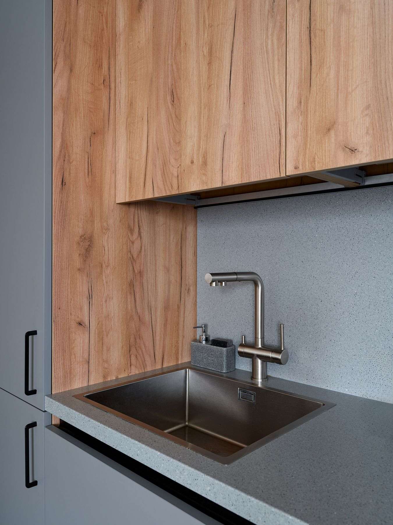 Планировка кухни – прямая, с симметричной геометрией. В центре – удобная рабочая зона, по бокам – высокие секции-колонны, а сверху – антресоли под самый потолок. Это решение дает максимум мест для хранения без визуального перегруза. Фасады выполнены в декорах «Дуб Крафт золотой» и «Пыльный серый». Столешница и фартук из искусственного камня с гранитным рисунком выглядят монолитно, без видимых стыков – семья уже оценила преимущества этого материала на предыдущей кухне.